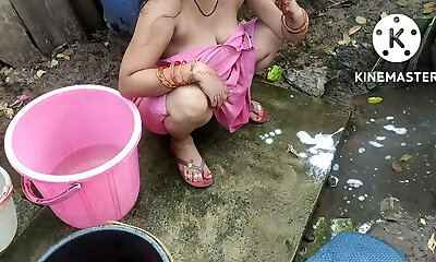 Indian house wife bathing outside