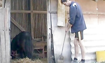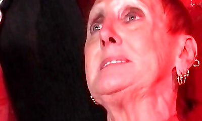 grandma with saggy milky udders gets her hairy cunt fucked by her house gimp